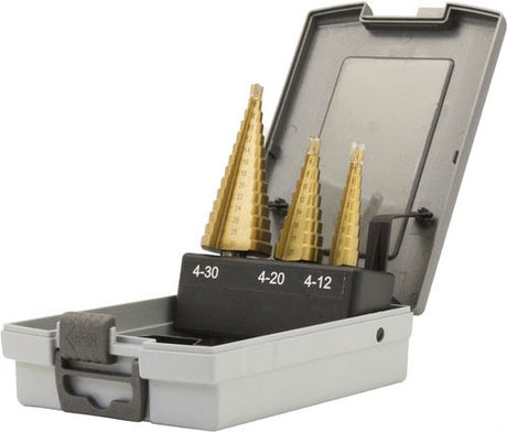 Brocas escalonadas; Juego de 3 piezas con recubrimiento de titanio; 4-30 mm