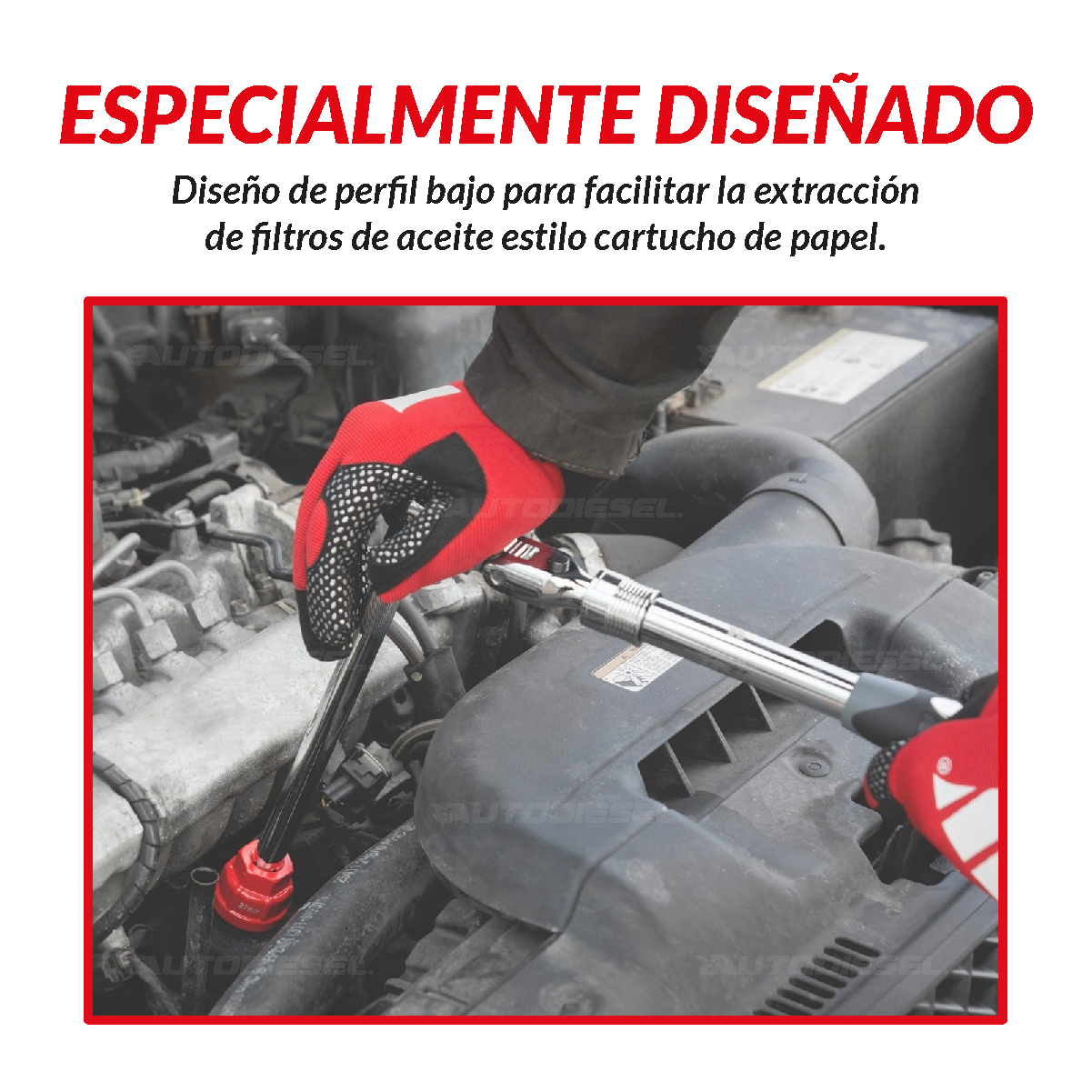 Diseño de perfil bajo para facilitar la extracción de filtros de aceite estilo cartucho de papel.