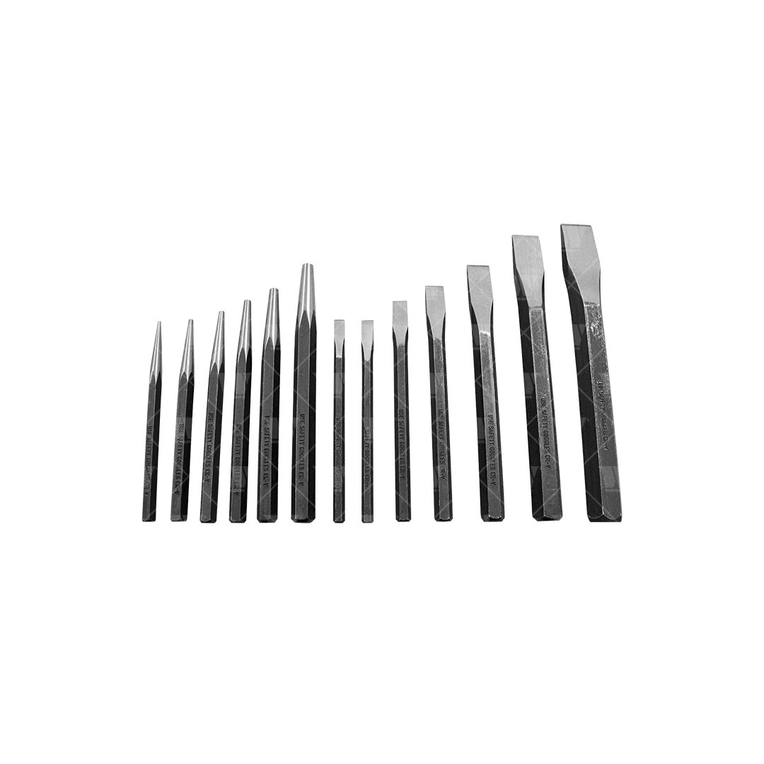 Botadores y Cinceles Versátiles: Para una Variedad de Usos. Acero Cromo Vanadio de Alta Calidad: Asegura un Rendimiento Excepcional. Endurecido y Templado: Máxima Durabilidad Garantizada. Cinceles Planos: Resistentes a la Fragmentación y Deformación (cabeza de hongo). Peso del Artículo: 5.000 lbs (aprox 2.27 kg) para Sensación Sólida y Control. Estuche Enrollable: Conveniente y Compacto. El Juego Incluye: 7x Botadores Cilíndricos: 3/32, 1/8, 5/32, 3/16, 1/4, 5/16 y 3/8 pulg. 6x Botadores Cónicos Cortos (Starter): 3/32, 1/8, 5/32, 3/16, 1/4 y 5/16 pulg. 4x Botadores de Centro (Granetes): 1/4, 5/16, 3/8 y 1/2 pulg. 7x Cinceles Planos: 1/4, 5/16, 3/8, 1/2, 5/8, 3/4 y 7/8 pulg. 2x Cinceles de Corte (Cape): 1/4 y 5/16 pulg. 1x Cincel de Punta Semicircular: 5/16 pulg. 2x Cinceles Punta de Diamante: 5/16 y 3/8 pulg. 1x Estuche Enrollable.