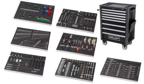 Estas robustas bandejas de espuma estándar industrial están precortadas y llenas con una variedad de herramientas que incluyen: