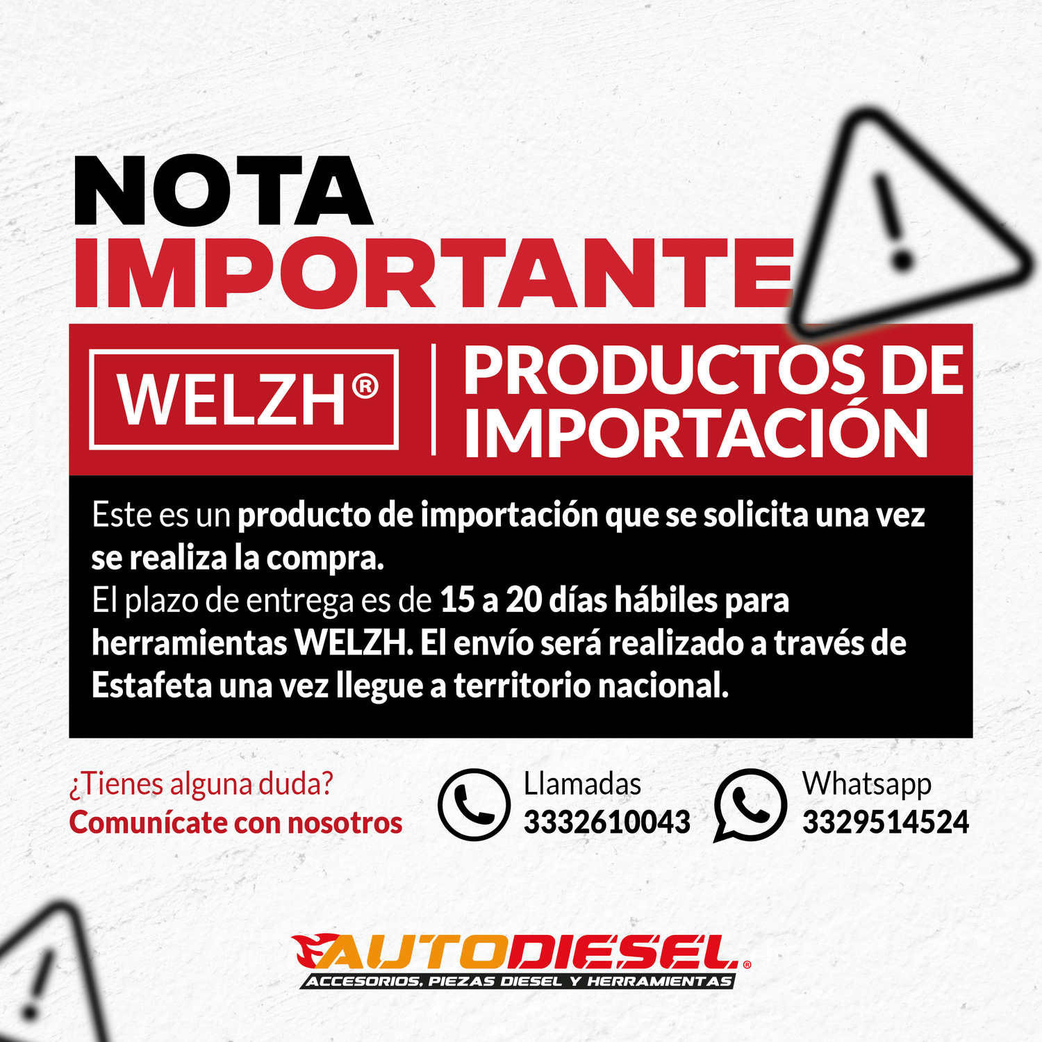 Plazo de entrega de 15 a 20 días hábiles para herramientas WELZH especificadas como producto de importación. El envío será realizado a través de Estafeta una vez llegue a territorio nacional.